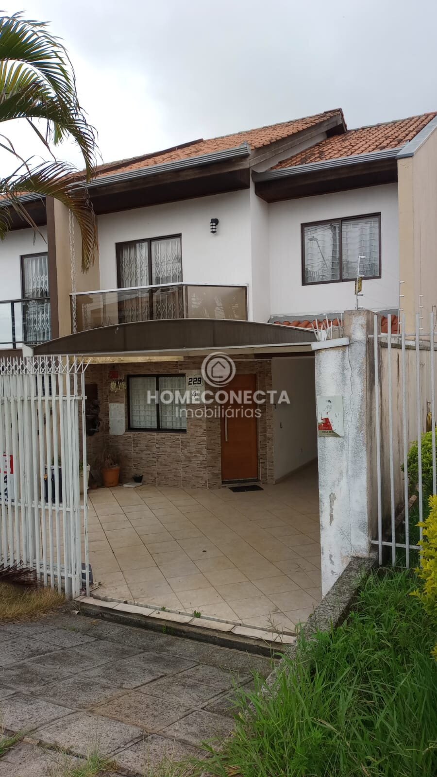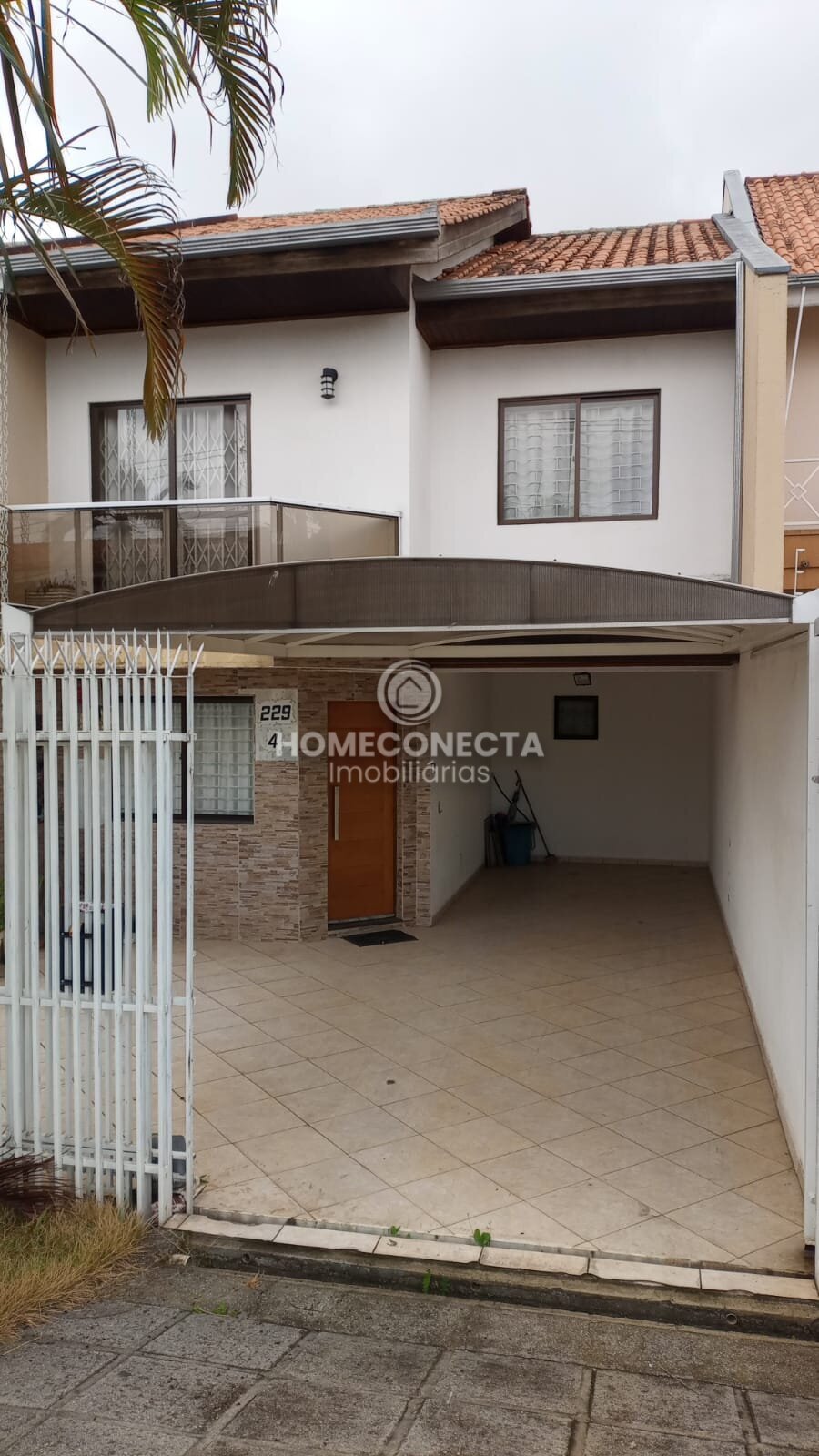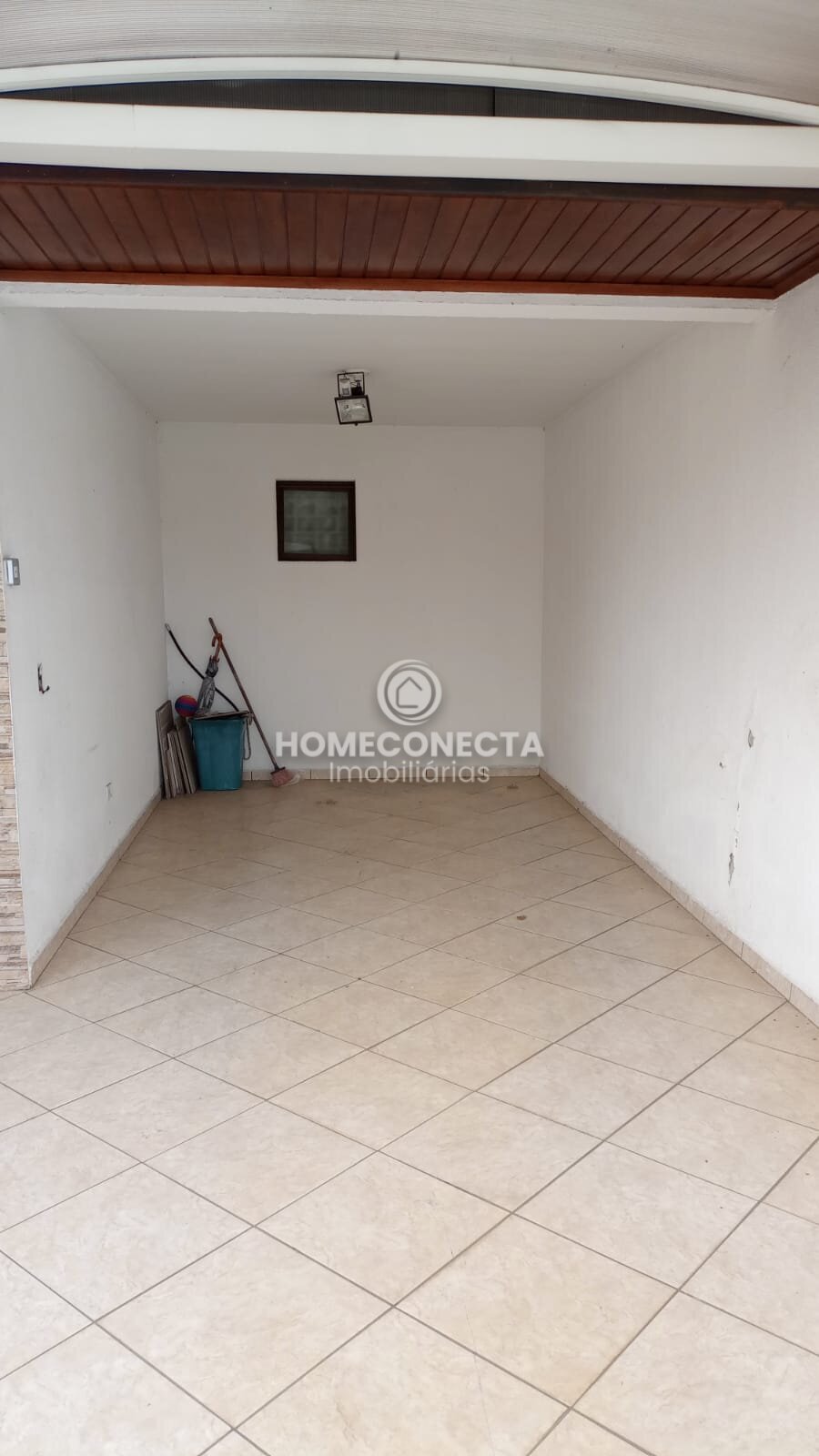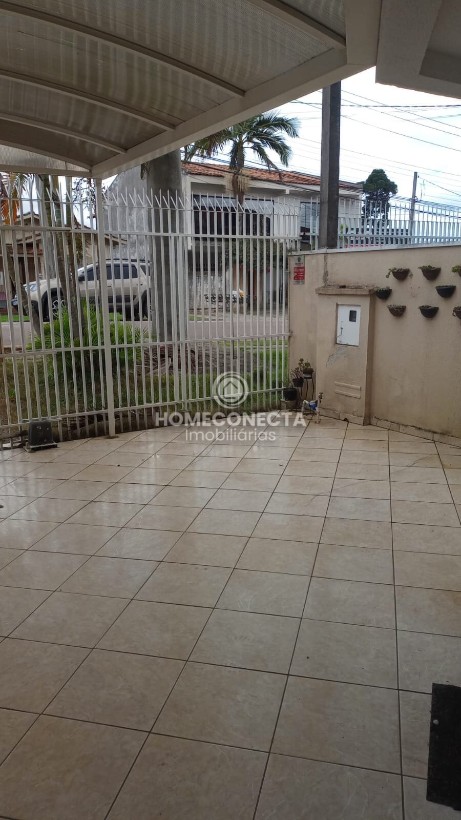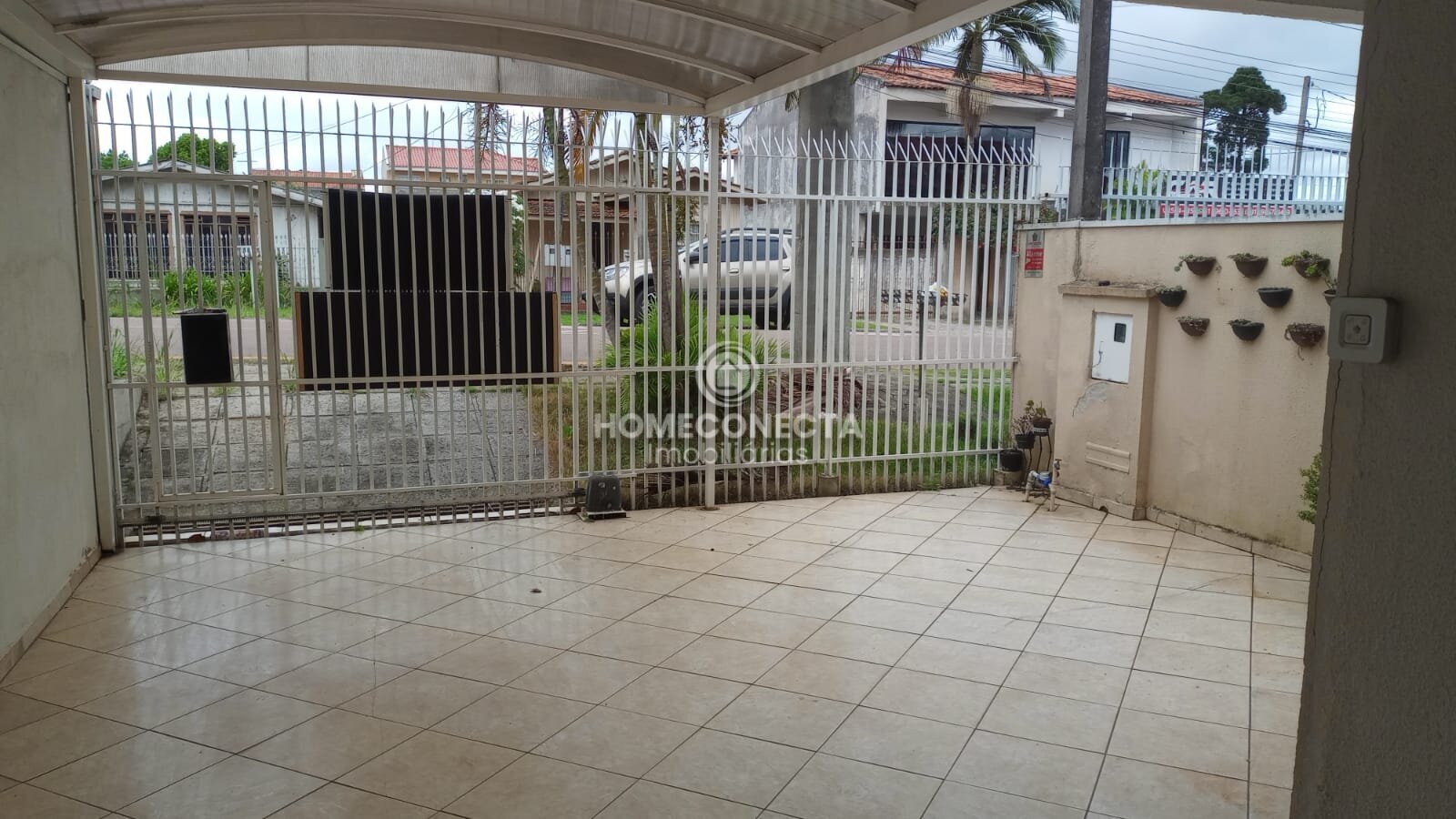 Na frente garagem coberta para até dois carros, mais espaço descoberto para um terceiro carro.
