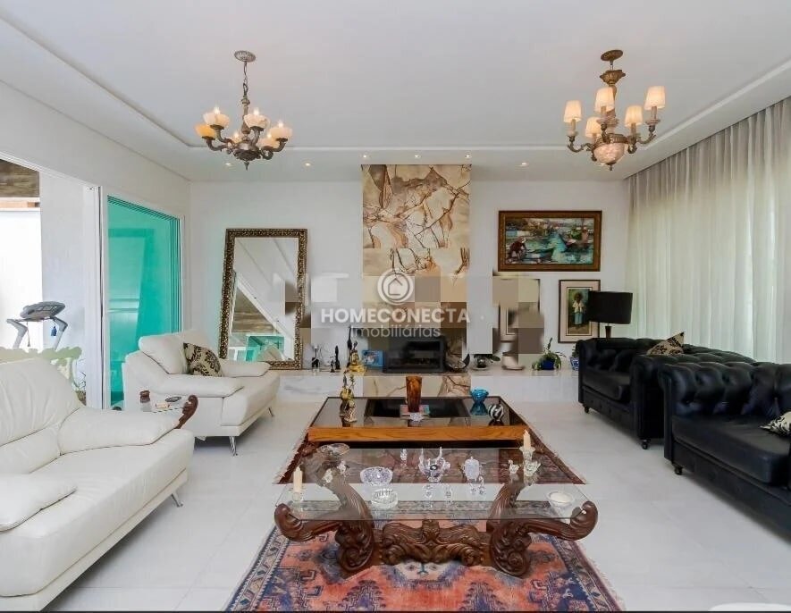 No piso inferior, um living para dois ambientes, sala de jantar, elevador, lareira, adega, cozinha integrada, área de serviço e dependência de serviços completos,